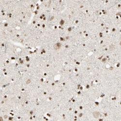 - Immunohistochemical staining of human cerebral cortex shows strong nuclear positivity in glial cells.
