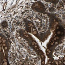 - Immunohistochemical staining of human colon shows strong granular cytoplasmic positivity in glandular cells.