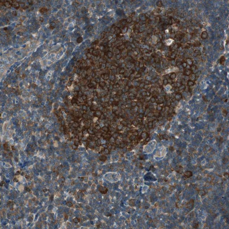 - Immunohistochemical staining of human tonsil shows strong cytoplasmic positivity in reaction center cells.