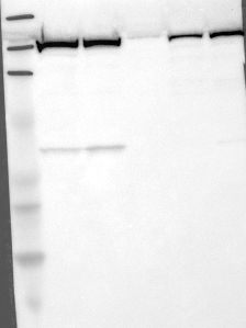 - Band of predicted size in kDa (+/-20%) with additional bands present.