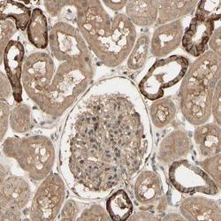 - Immunohistochemical staining of human kidney shows strong cytoplasmic and membranous positivity in cells in tubules.