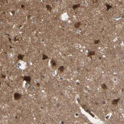 - Immunohistochemical staining of human cerebral cortex shows strong nuclear and cytoplasmic positivity in neuronal cells.