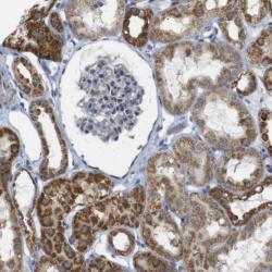 - Immunohistochemical staining of human kidney shows distinct granular cytoplasmic positivity in cells in tubules.