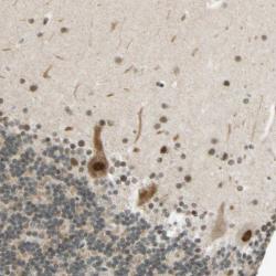 - Immunohistochemical staining of human cerebellum shows strong nuclear positivity in purkinje cells.