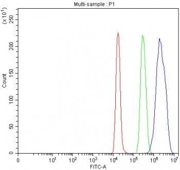 - Flow cytometry testing of rat C6 cells with SMARCB1 antibody at 1ug/million cells (blocked with goat sera); Red=cells alone, Green=isotype control, Blue= SMARCB1 antibody.
