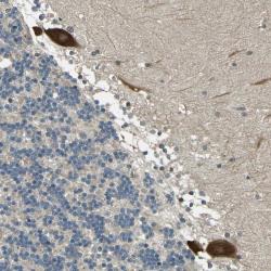 - Immunohistochemical staining of human cerebellum shows strong cytoplasmic positivity in purkinje cells.
