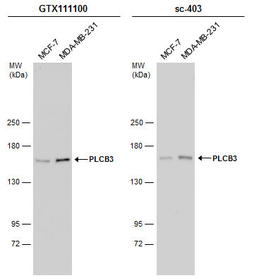 - Various whole cell extracts (30 ?g) were separated by 5% SDS-PAGE, and the membranes were blotted with PLCB3 antibody (GTX111100) diluted at 1:1000 and competitor's antibody (sc-403) diluted at 1:1000. The HRP-conjugated anti-rabbit IgG antibody (GTX213110-01) was used to detect the primary antibody.