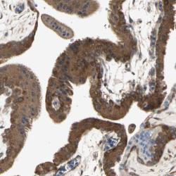 - Immunohistochemical staining of human placenta shows strong cytoplasmic positivity in trophoblastic cells.