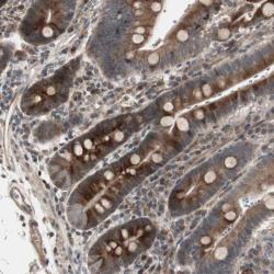 - Immunohistochemical staining of human duodenum shows strong cytoplasmic positivity in glandular cells.
