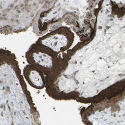 - Immunohistochemical staining of human placenta shows strong cytoplasmic positivity in trophoblastic cells.