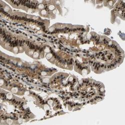 - Immunohistochemical staining of human duodenum shows distinct nuclear positivity in glandular cells.