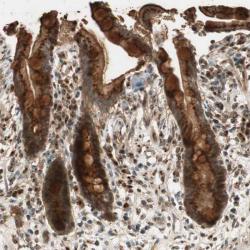 - Immunohistochemical staining of human colon shows distinct dot like cytoplasmic positivity in glandular cells.
