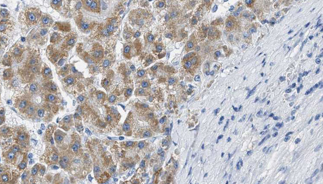 - 1:100 staining human liver carcinoma tissues by IHC-P. The sample was formaldehyde fixed and a heat mediated antigen retrieval step in citrate buffer was performed. The sample was then blocked and incubated with the antibody for 1.5 hours at 22°C. An HRP conjugated goat anti-rabbit antibody was used as the secondary.