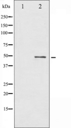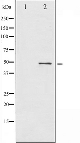 - Western blot analysis of BLNK expression in etoposide treated 293 whole cells lysates. The lane on the left is treated with the antigen-specific peptide.