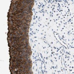 - Immunohistochemical staining of human nasopharynx shows strong cytoplasmic positivity in respiratory epithelial cells.