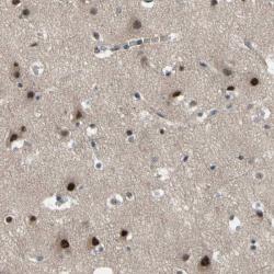 - Immunohistochemical staining of human cerebral cortex shows strong nuclear positivity in neuronal cells.