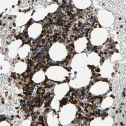 - Immunohistochemical staining of human bone marrow shows strong cytoplasmic positivity in bone marrow poietic cells.