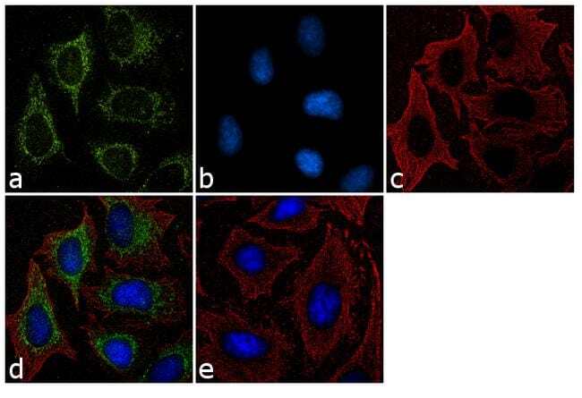 - Immunofluorescent analysis of Furin Convertase was performed using 70% confluent log phase HeLa cells. The cells were fixed with Methanol for 5 minutes, and blocked with 2% BSA for 1 hour at room temperature. The cells were labeled with Furin Convertase Rabbit Polyclonal Antibody (Product # PA1-062) at 2 µg/mL in 0.1% BSA and incubated for 3 hours at room temperature and then labeled with Goat anti-Rabbit IgG (Heavy Chain) Superclonal™ Secondary Antibody, Alexa Fluor® 488 conjugate (Product # A27034) a dilution of 1:2000 for 45 minutes at room temperature (Panel a: green). Cytoskeleton was stained with alpha-Tubulin Monoclonal Antibody (Product # 32-2500, 1 µg/mL) followed by Goat anti-Mouse IgG Secondary Antibody, Alexa Fluor® 594 conjugate (Product # A-11032, 1:400) (Panel c: red). Nuclei (Panel b: blue) were stained with SlowFade® Gold Antifade Mountant with DAPI (Product # S36938). Panel d represents the merged image showing cytoplasmic localization. Panel e shows the no primary antibody control. The images were captured at 60X magnification.