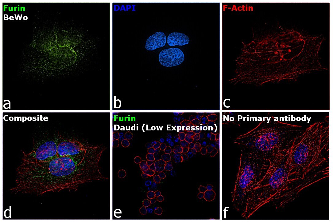 - Immunofluorescence analysis of Furin was performed using 70% confluent log phase BeWo cells. The cells were fixed with 4% paraformaldehyde for 10 minutes, permeabilized with 0.1% Triton™ X-100 for 15 minutes, and blocked with 2% BSA for 45 minutes at room temperature. The cells were labeled with Furin Polyclonal Antibody (Product # PA1-062) at 2 µg/mL dilution in 0.1% BSA, incubated at 4 degree celsius overnight and then labeled with Donkey anti-Rabbit IgG (H+L) Highly Cross-Adsorbed Secondary Antibody, Alexa Fluor Plus 488 (Product # A32790), (1:2000 dilution), for 45 minutes at room temperature (Panel a: Green). Nuclei (Panel b: Blue) were stained with ProLong™ Diamond Antifade Mountant with DAPI (Product # P36962). F-actin (Panel c: Red) was stained with Rhodamine Phalloidin (Product # R415, 1:300). Panel d represents the merged image showing predominantly Golgi Complex and cytoplasmic localization. Panel e represents Daudi cells with lower expression of Furin (DOI: 10.1099/0022-1317-75-10-2821). Panel f represents control cells with no primary antibody to assess background. The images were captured at 60X magnification.