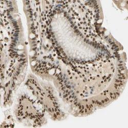 - Immunohistochemical staining of human stomach shows distinct nuclear positivity in glandular cells.