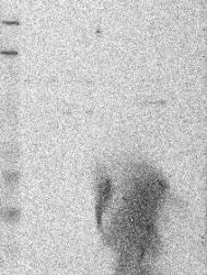 - Band of predicted size in kDa (+/-20%) with additional bands present.