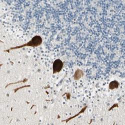 - Immunohistochemical staining of human cerebellum shows strong cytoplasmic positivity in purkinje cells.