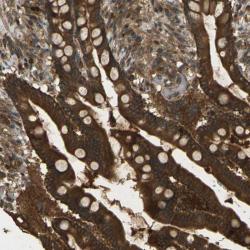 - Immunohistochemical staining of human colon shows strong cytoplasmic positivity in glandular cells.
