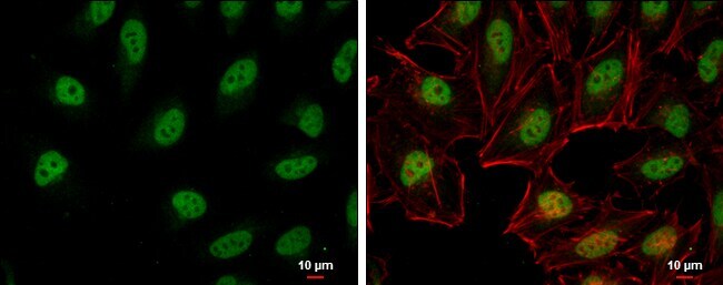 - Immunocytochemistry-Immunofluorescence analysis of RFC1 was performed in HeLa cells fixed in 4% paraformaldehyde at RT for 15 min. Green: RFC1 Polyclonal Antibody (Product # PA5-35965) diluted at 1:1000. Red: phalloidin, a cytoskeleton marker. Blue: Hoechst 33342 staining. Scale bar = 10 µm.