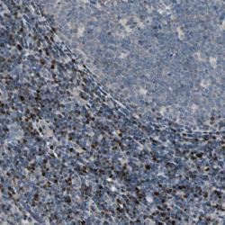 - Immunohistochemical staining of human tonsil shows strong nuclear positivity in lymphoid cells outside reaction centra.