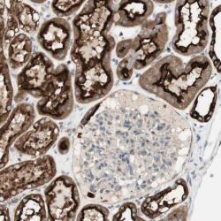 - Immunohistochemical staining of human kidney shows strong cytoplasmic positivity in cells in tubules.