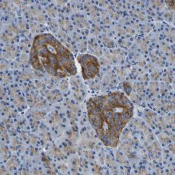 - Immunohistochemical staining of human pancreas shows strong positivity in islet cells.