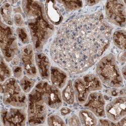 - Immunohistochemical staining of human kidney shows strong cytoplasmic positivity in cells in tubules.