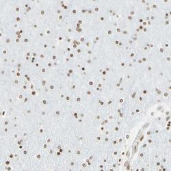 - Immunohistochemical staining of human cerebral cortex shows distinct nuclear positivity in glial cells.