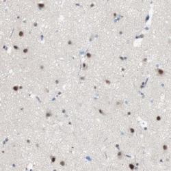 - Immunohistochemical staining of human cerebral cortex shows strong nuclear positivity in neuronal cells.