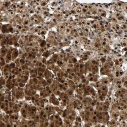 - Immunohistochemical staining of human adrenal gland shows strong cytoplasmic and nuclear positivity in cortical cells.