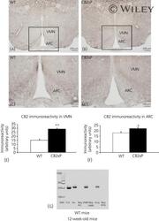 - 1 CB2 receptor expression in the hypothalamus of wild-type (WT) and CB2xP mice. Immunohistochemistry of CB2 receptor in the hypothalamus from 12-week-old WT and CB2xP mice ( a - d ) and mRNA expression in the ventromedial nucleus of the hypothalamus (VMN) and arcuate nucleus (ARC) of WT mice ( g ). CB2 protein as well as CB2 mRNA are expressed in the hypothalamus of WT mice ( a , c , g ). Densitometric analysis of VMN and ARC immunoreactivity ( e , f ) showed increased CB2 protein expression in VMN and ARC from CB2xP versus WT mice (Student t test, *P < 0.05; **P < 0.01). ( c, d ) Higher magnification views of the square areas in ( a ) and ( b ), respectively. Cnr2 gene expression was detected by RNA reverse-transcription (RT) to cDNA and subsequent polymerase amplification with CB2 specific primers. 'Ctrl' lane represents CB2 amplification from spleen, a tissue highly expressing CB2 receptor. 'Neg' lanes represent CB2 amplification from VMN, ARC and amygdala RT reactions in which the RT enzyme was omitted (n = 5 mice each genotype). The immunohistochemical images are representative of several slices. Scale bars are included in each image.