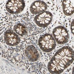 - Immunohistochemical staining of human rectum shows distinct cytoplasmic positivity in glandular cells.