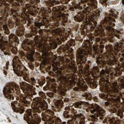 - Immunohistochemical staining of human pancreas shows strong cytoplasmic positivity in exocrine glandular cells.