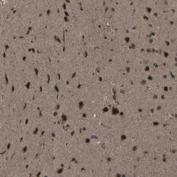 - Immunohistochemical staining of human cerebral cortex shows strong nuclear and cytoplasmic positivity in neuronal cells.