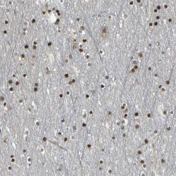 - Immunohistochemical staining of human cerebral cortex shows strong nuclear positivity in glial cells.