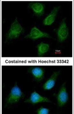 - Immunofluorescent analysis of CACNB1 in methanol-fixed HeLa cells using a CACNB1 polyclonal antibody (Product # PA5-28900) at a 1:200 dilution.