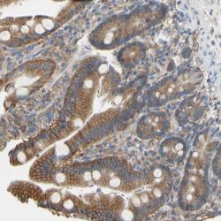 - Immunohistochemical staining of human duodenum shows moderate cytoplasmic positivity in glandular cells.