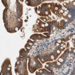 - Immunohistochemical staining of human duodenum shows distinct cytoplasmic positivity in glandular cells.