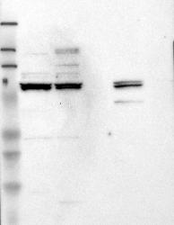 - Band of predicted size in kDa (+/-20%) with additional bands present.