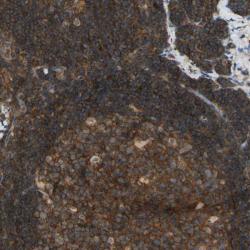 - Immunohistochemical staining of human lymph node shows strong cytoplasmic positivity in reaction center cells and lymphoid cells outside reaction centra.