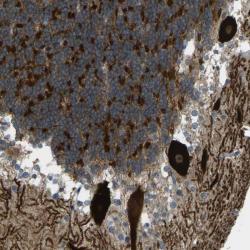 - Immunohistochemical staining of human cerebellum shows strong cytoplasmic positivity in purkinje cells and cells in granular layer.