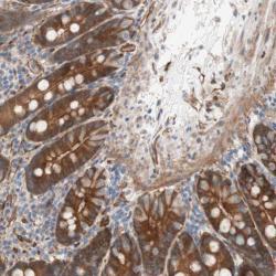 - Immunohistochemical staining of human duodenum shows distinct cytoplasmic positivity in glandular cells and smooth muscle cells.