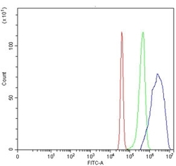 - Flow cytometry testing of human SiHa cells with PSF antibody at 1ug/million cells (blocked with goat sera); Red=cells alone, Green=isotype control, Blue= PSF antibody.