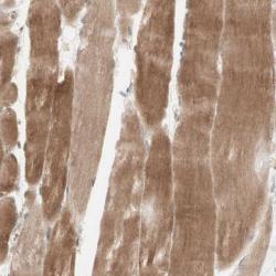 - Immunohistochemical staining of human skeletal muscle shows moderate cytoplasmic positivity in myocytes.