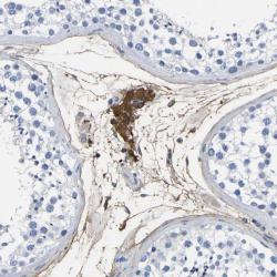 - Immunohistochemical staining of human testis shows strong cytoplasmic positivity in leydig cells.
